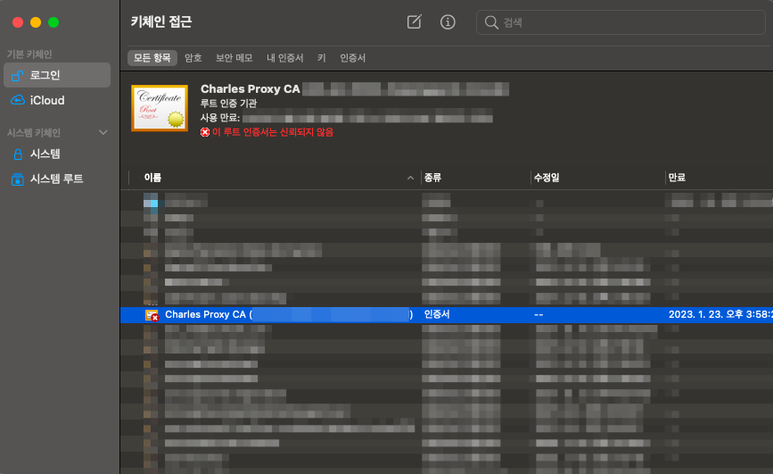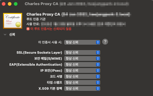 - 키체인 접근 설정에서 Charles Proxy 인증서 더블 클릭 후